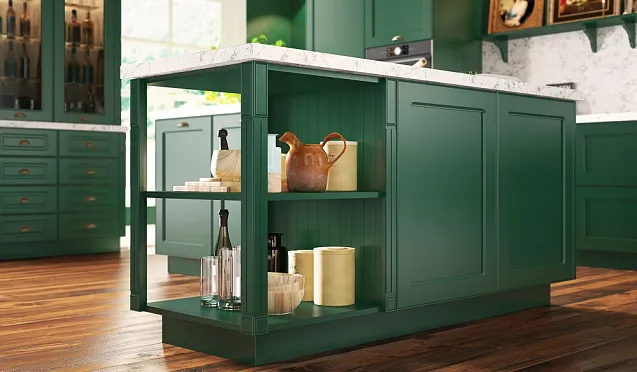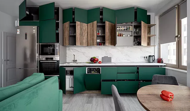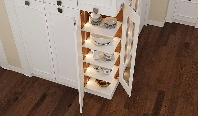 Для использования каждого сантиметра кухонного пространства с пользой рекомендуется использовать угловые шкафы. В свободных углах устанавливают секции для посуды, оснащенные вращающимися полками и выдвижными механизмами. Это позволяет сэкономить место и обеспечивает удобный доступ к содержимому.