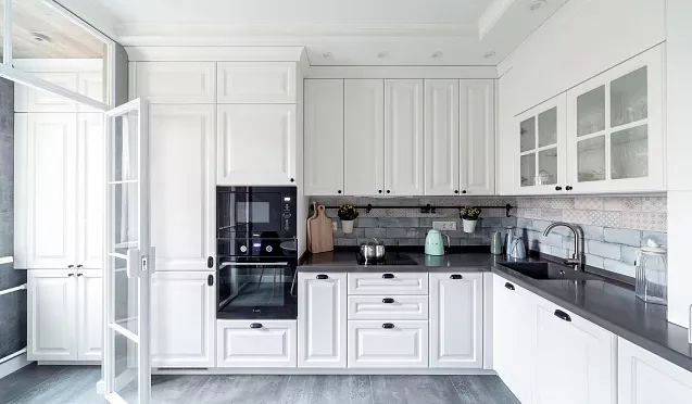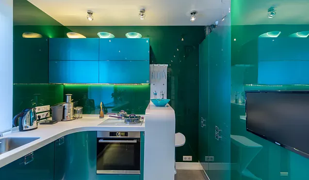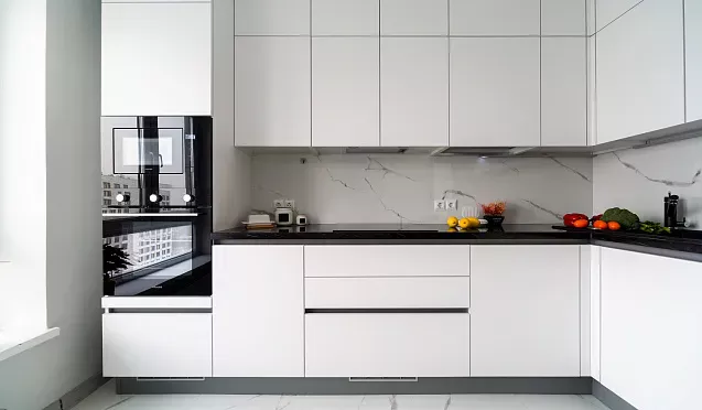 Бытовую технику лучше спрятать за фасадами встроенных шкафов. Благодаря этому приему кухонное помещение визуально будет выглядеть более просторным и свободным.