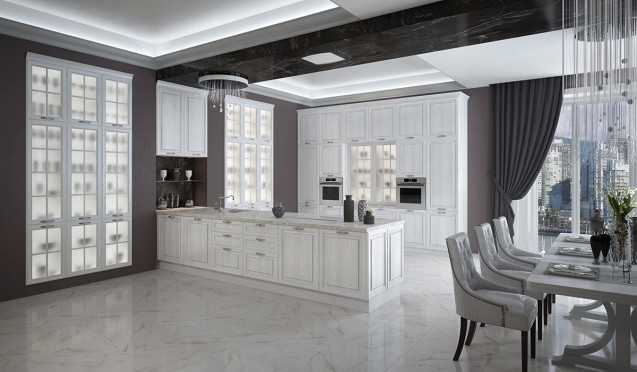 Настоящие эстеты и ценители роскоши выбирают модели в классическом стиле. Кухни белых цветов в этом случае декорируют позолотой, резьбой, лепниной и патиной.