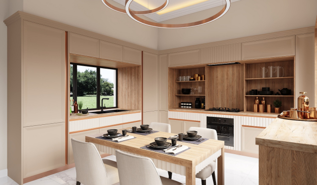 При выборе кухни в бежевом цвете, обратите внимание на ее дизайн. К одним из популярных относятся скандинавские модели кухни. Они отличаются простыми формами и строгими линиями. Фасады таких комплектов обычно гладкие или декорированные лаконичными узорами, стеклянными вставками. Версии сканди выбирают любители минимализма и комфорта.