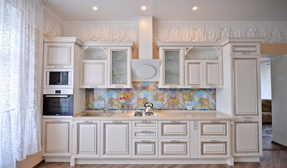 Большой загородный дом украсит модель в классическом стиле. Подобную мебель отличает выверенная геометрия, симметричные линии и роскошная отделка. Для оформления фасадов используются резные узоры, лепнина, мозаики, патина и позолоченные элементы.