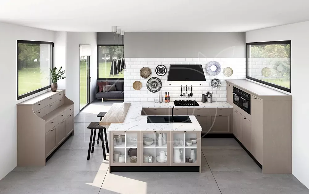 - Размер. Мебель размещается в больших столовых и поэтому имеет большие размеры. Планировка - П-образная или квадратная, обычно с островом. Кухонные гарнитуры более сложные и часто имеют барную стойку или витражные шкафы. Дешевые модели обычно меньше по размеру и имеют линейную планировку.