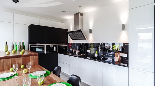 Черно-белая кухня-гостиная