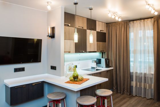 Угловые кухни тоже подходят для малогабаритных пространств. Такие версии смотрятся эффектно и интересно. При этом Г-образная модель позволяет задействовать свободный угол. В нем можно разместить секцию или дополнительные полки.