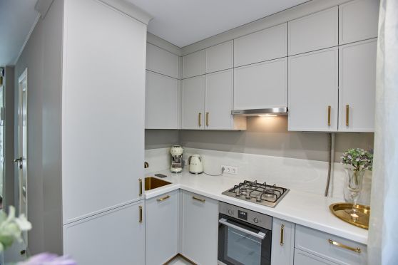 Кухонная мебель для небольшого помещения должна быть светлой. Идеальный вариант – версии белого, бежевого, молочного, светло-голубого или розового цвета. Подобные версии способны визуально расширить пространство, сделать его более просторным и светлым.