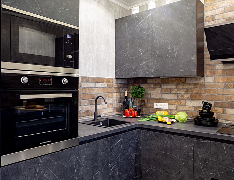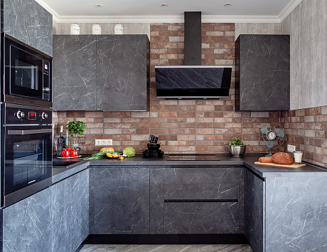 Современные кухни могут поражать красотой материалов. Как Вам, к примеру, гарнитур из мрамора? Клиенты КД часто выбирают такие, и неизменно остаются довольны. Конечно же, настоящий мрамор здесь не используется, ведь этот материал слишком дорогой, тяжёлый и непрактичный, чтобы делать из него кухонные фасады. Вместо него применяют экомассив, который создаёт трёхмерную детализированную имитацию мраморных поверхностей.
