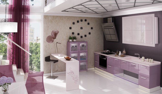 наличие незначительной площади требует использования более светлых тонов. Благодаря этому кухни фиолетового цвета способны смотреться не только изящно, но и существенно расширять небольшую комнату: потолки кажутся высокими, расстояние между стенами – максимально допустимым;
