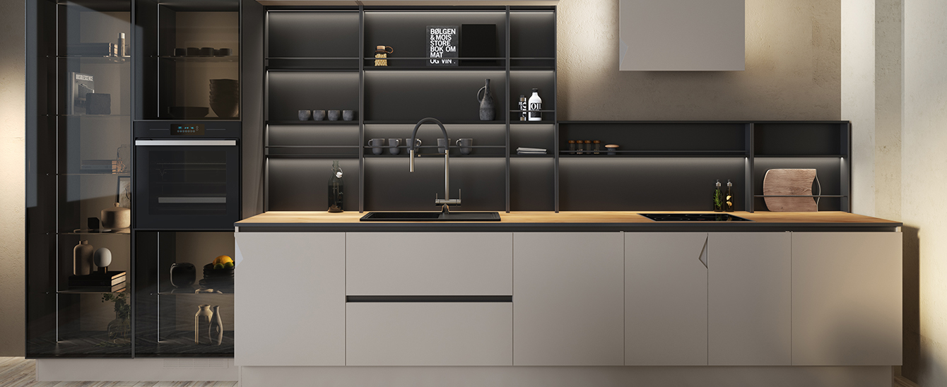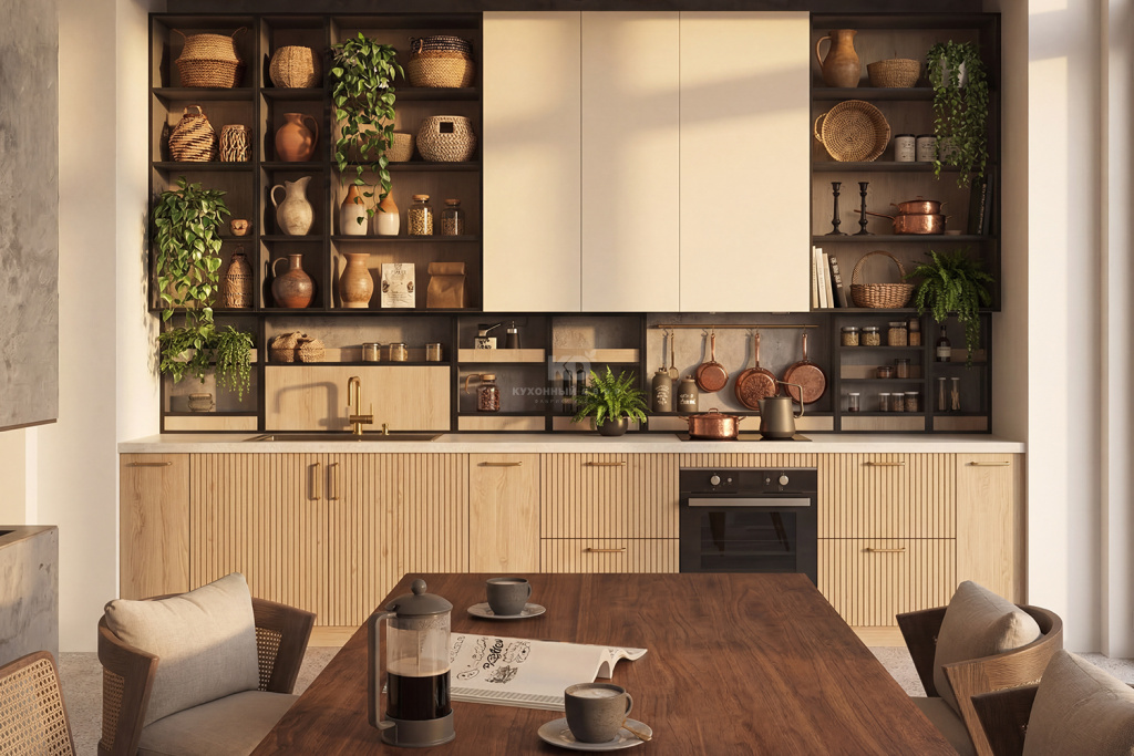 Рифлёные поверхности, бархатистое покрытие Мягкое прикосновение (Soft Touch) и тепло натурального дерева добавляют интерьеру глубины и тактильности. К таким материалам хочется прикасаться — они делают пространство живым, наполненным ощущениями и комфортом. Именно за счёт этих деталей кухня превращается из функциональной зоны в по-настоящему уютное место притяжения для всей семьи.