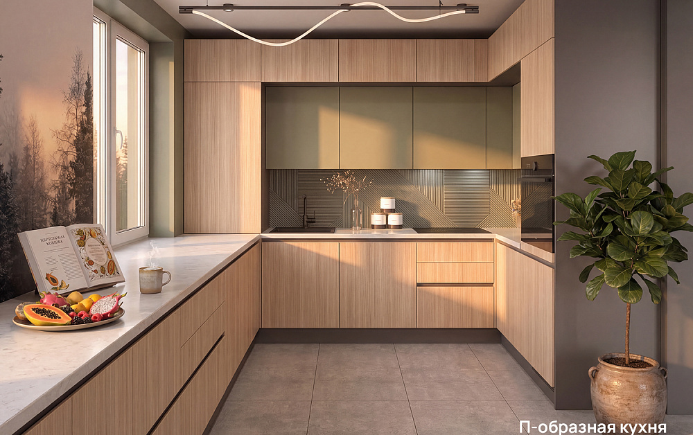 - П-образная компоновка идеально подходит для активной готовки: она обеспечивает максимум рабочей поверхности и вместительное хранение, превращая кухню в организованное пространство, где всё под рукой.