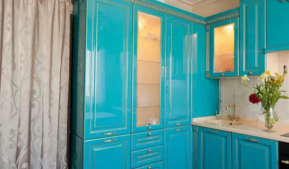 Глянец роскошно смотрится сам по себе, поэтому декоративную отделку для таких поверхностей используют умеренно. Дверцы оформляют рамками, вставками из стекла или контрастными элементами. Украшением фасадов могут стать ручки необычной формы – круглые, вытянутые или квадратные.