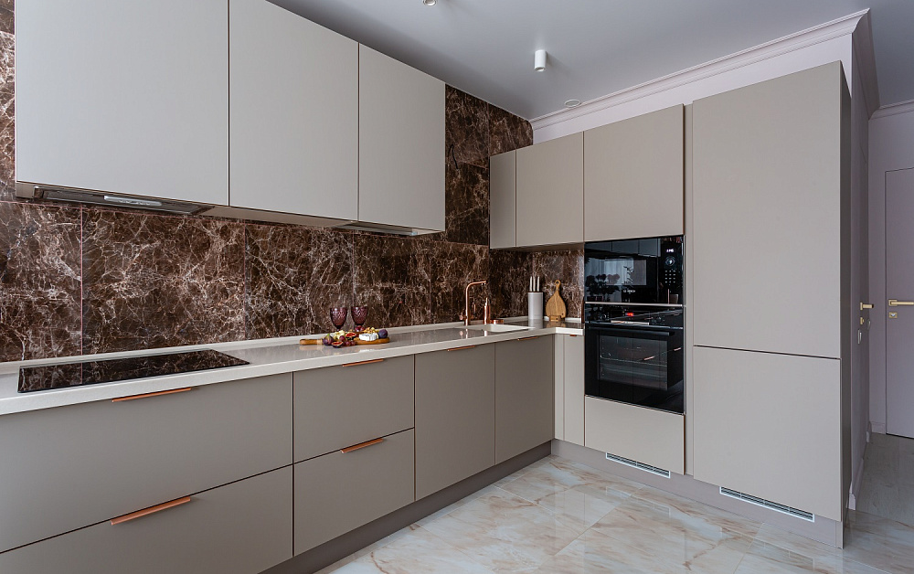 Столешница, заставленная разнообразной бытовой техникой, смотрится довольно неряшливо, особенно в небольших пространствах. Поэтому кухонная мебель со встроенной техникой выглядит гораздо привлекательнее. Спрятать за фасадами можно не только крупные предметы – вытяжку, духовой шкаф, посудомоечную машину, холодильник. Более мелкую технику, например, кофемашину, мультиварку и тостер тоже можно скрыть от глаз. Благодаря этому рабочая поверхность всегда будет выглядеть свободной и аккуратной.
