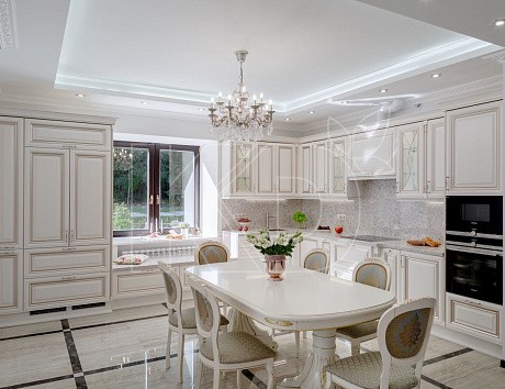 - Классика. Вечно актуальный вариант уместен и в частном доме. Он подойдет кухне с большими окнами и высокими потолками.