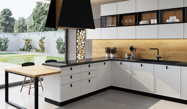 Г-образные гарнитуры позволяют рационально использовать свободный угол. В него обычно встраивают мойку, дополнительные полки или секцию для посуды. Это лучшее решение для комнаты средних размеров. Если вместо верхних шкафов в таком комплекте сделать навесные полки, в пространстве не возникнет затененности.