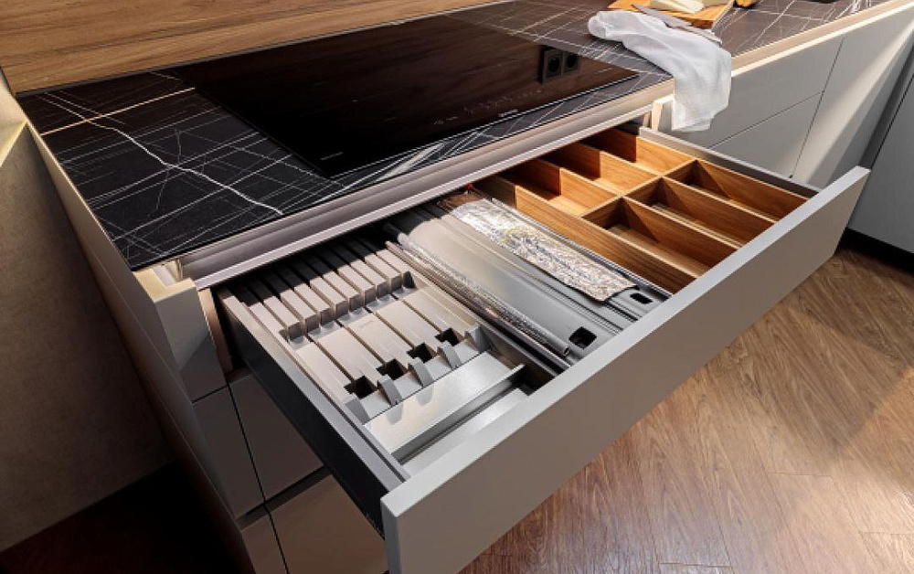 Все кухонные гарнитуры имеют рабочую поверхность, под которой устанавливают места хранения. Специалисты рекомендуют оборудовать нижние модули выдвижными полками, так как они вмещают большое количество предметов и более удобны в использовании. Традиционные ящики лучше оснастить разделителями, что обеспечит комфортное размещение предметов.