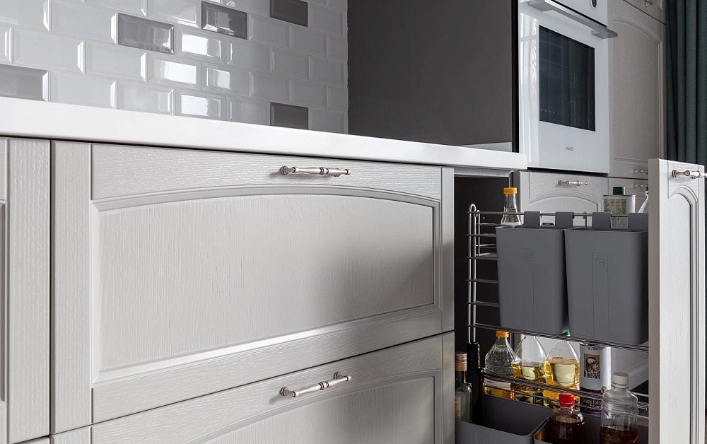 Поклонники более современных решений выберут технологичный хай-тек. Комплекты в этом стиле отличаются гладкими дверцами с лаконичными или утопленными ручками, сочетанием хромированных и пластиковых деталей. Бытовая техника прячется за фасадами шкафов. В целом такой дизайн предполагает минимализм и рациональное использование каждого сантиметра комнаты.