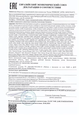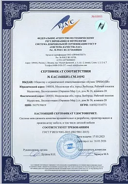 Участник телепередачи «Квартирный вопрос»Наличие у бренда сертификатов – прямое подтверждение того, что он выпускает надежную продукцию. Так, вся продукция о т"Кухонный Двор" является обладателем международного сертификата соответствия ИСО-9001. Он подтверждает, что производство мебели соответствует признанным стандартам качества. Наличие такого сертификата позволяет бренду выйти на международный рынок, свидетельствует о корректности всех процессов при разработке, проектировании и создании мебели, а также повышает конкурентоспособность.