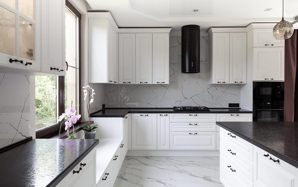 В больших комнатах можно использовать комбинированные кухонные гарнитуры. В таких моделях нижние фасады обычно выполняют в темном цвете, а верхние в белом. Благодаря такому подходу можно сделать пространство более интересным и гармоничным.