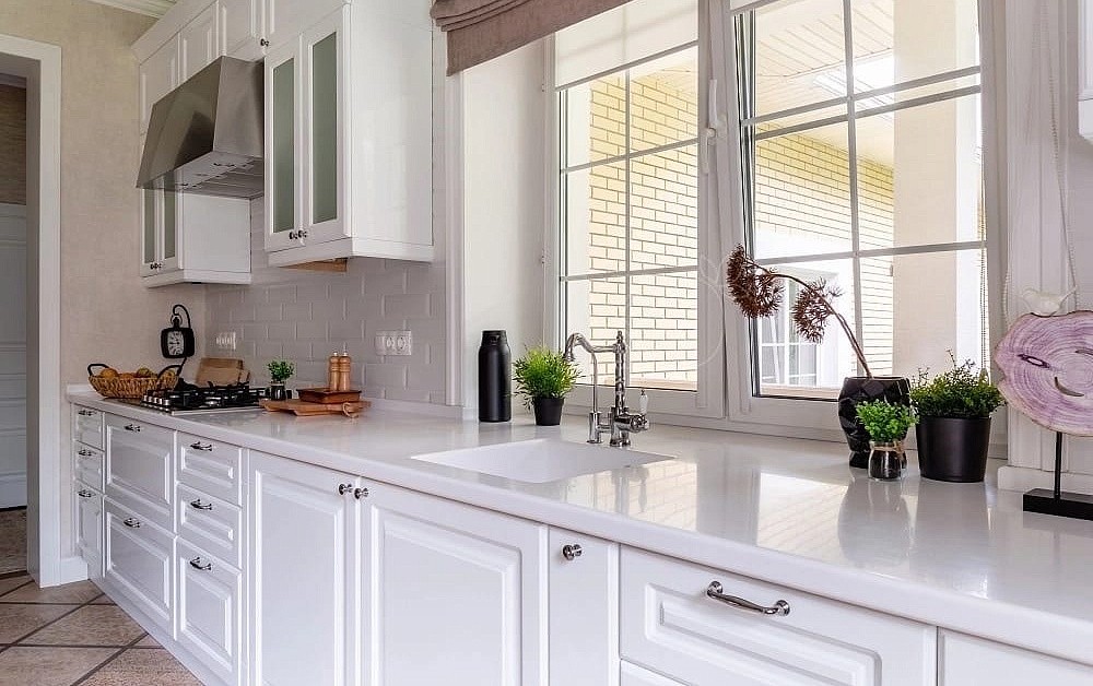 Для небольших помещениях белая кухня – настоящая находка, способная визуально увеличить пространство. Обеспечивается это за счет того, что светлые поверхности отражают солнечные лучи. Разбавить монотонность белоснежных фасадов можно с помощью ярких акцентов – фартука, рабочей поверхности и элементов декора.