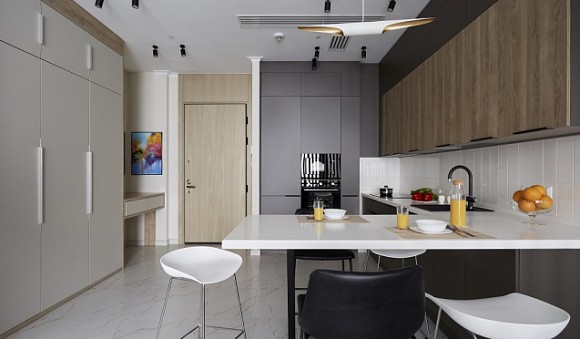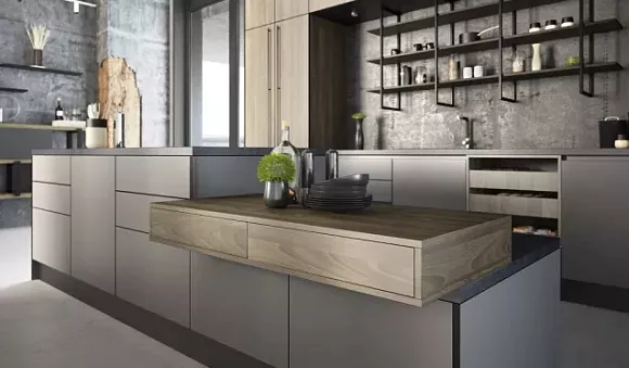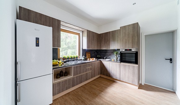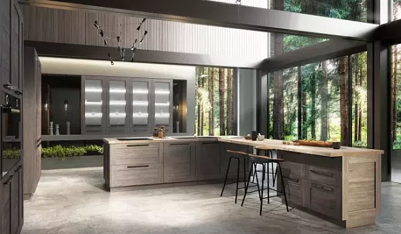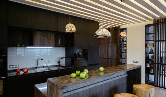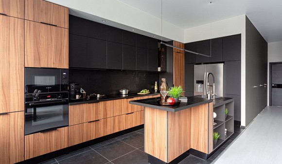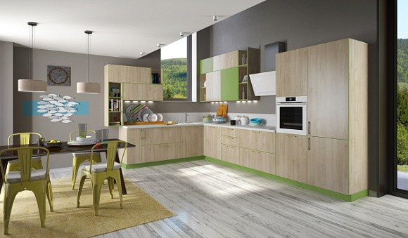 Широкий ассортимент. Планировка комплекта может быть линейной, П-образной, островной, угловой. Интересно выглядят модели с барными стойками.