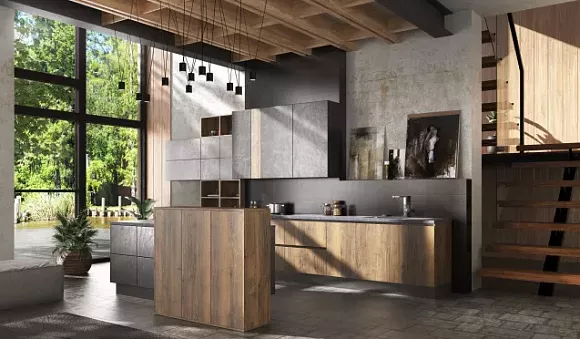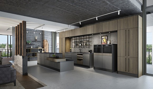 В коричневых оттенках часто выполняют гарнитуры в стиле лофт. Для этого направления характерна простота форм, отсутствие вычурного декора. Для оформления помещения используются картины в духе поп-арт, кирпичная кладка, декоративная штукатурка. Открытые коммуникации тоже выступают как часть дизайна.