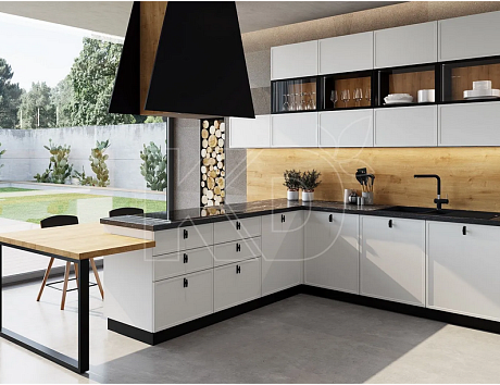 Черно-белая кухня в классическом исполнении выглядит элегантно. Однако принт с цветами сделает мебель более эффектной. При этом грамотное сочетание оттенков создаст гармоничное восприятие и визуально преобразит кухонное пространство. Для стилевого созвучия допустимо также подобрать стол с идентичным рисунком.