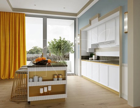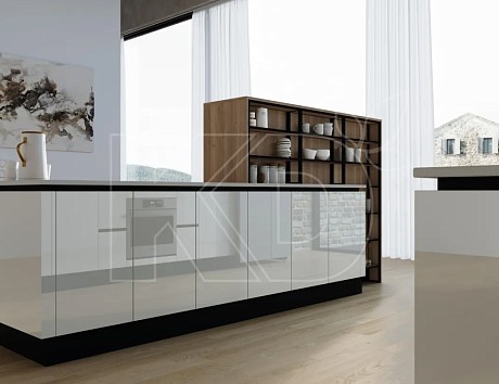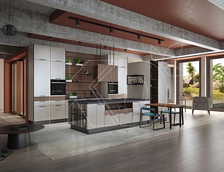 При панорамном остеклении лучше выбрать кухонный гарнитур с высокими вертикальными шкафами, которые следует установить у свободной стены. Рабочую поверхность и мойку можно вынести на островную конструкцию.