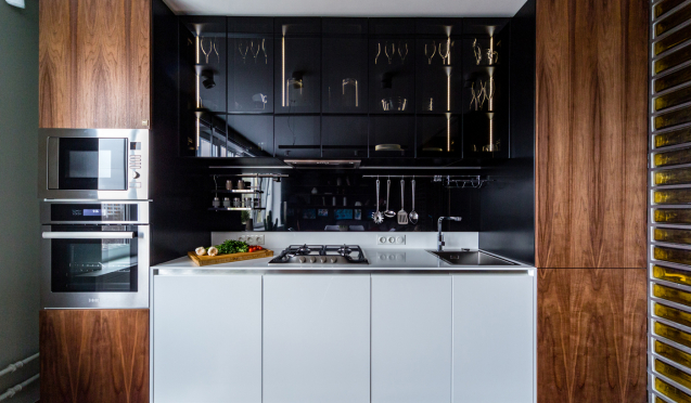 Выбирайте встроенную бытовую технику, которая имеет небольшие размеры. Также отдавайте предпочтение миниатюрным тостерам, кофеваркам, микроволновым печам. Можно установить выдвижную или телескопическую вытяжку. Она не будет занимать много места, дополнит современный стиль интерьера.