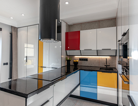 • Свет и цвет! Чем меньше пространства, тем выгоднее использовать светлые фасады и хорошее освещение. А если хочется чего-нибудь оригинального, то пусть фасады будут светлыми, а кромки – чёрными! Например, как в «Мондриане» или «Ханне Блэк»!