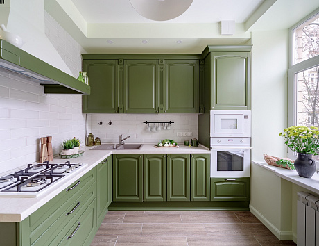 Г-образный кухонный гарнитур для маленькой кухни лучше всего размещать недалеко от окна. Естественное освещение не только наполняет интерьеры лёгкостью, но и обеспечивает хозяевам отличное настроение! А без него, как известно, вкуснятины не приготовишь!