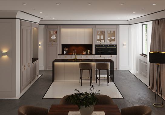 Контрастная столешница в обеденной зоне – финальный штрих, вносящий нотку модерна в благородный неоклассический облик.