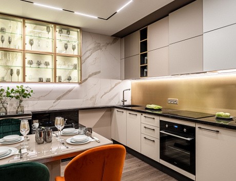 4. Серые кухни, бежевые или другие светлые эффектно сочетаются со светлым полом. Он требует постоянного ухода, но выглядит очень стильно.