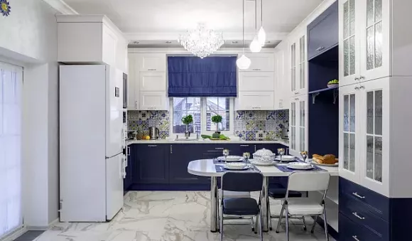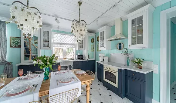 Синий и белый цвета подходят для прованса и кантри. Они помогают создать светлую и просторную кухню.