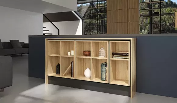Теплые оттенки желтого цвета и охры отлично смотрятся на лазурной кухне. Чтобы создать объемное пространство, в качестве дополнения к лазури используют детали из дерева и металла.