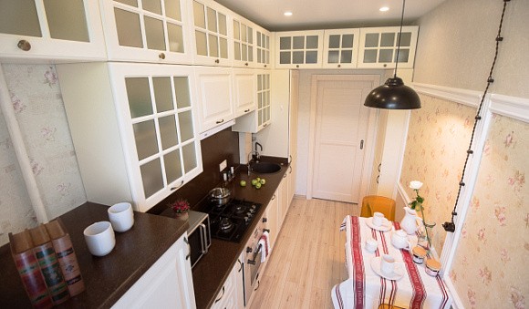 Для прямоугольной комнаты подойдет двухрядная модель. Шкафы такой кухни размещаются вдоль параллельных стен друг напротив друга. При этом расстояние между рядами должно составлять 1,2-1,5 метра. Только в этом случае будет удобно пользоваться мебелью.