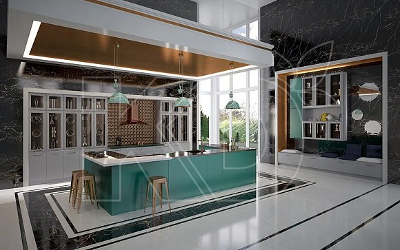 - Неоклассицизм, выглядящий более богатым в сравнении с классикой. Для такой угловой кухни оливкового цвета характерны текстурированные фасады и тщательно продуманный интерьер с лепниной или золотым декором.
