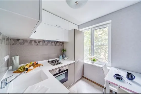 - Эргономичность. Чем компактнее мебель, тем проще соблюсти правило рабочего треугольника, при котором все необходимое будет у хозяйки под руками. В результате в ходе приготовления блюд не потребуется совершать лишних движений между холодильником, плитой и мойкой.