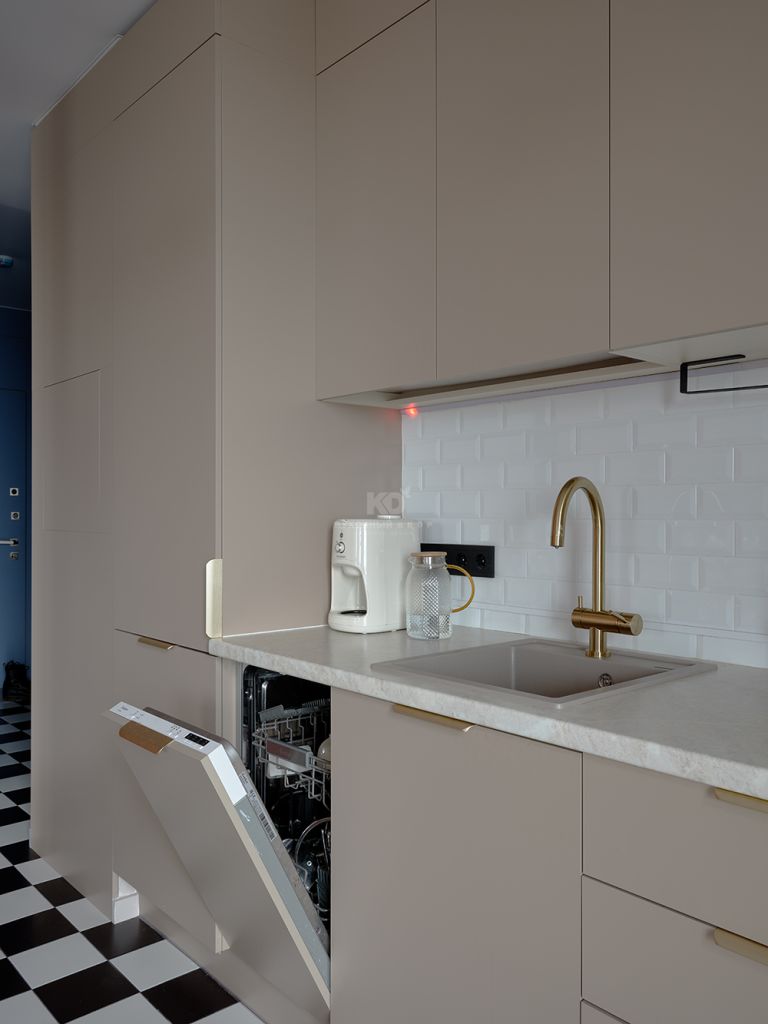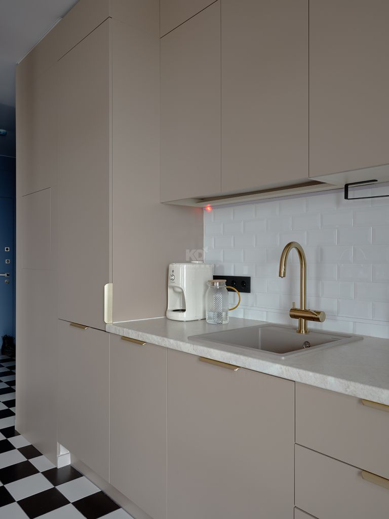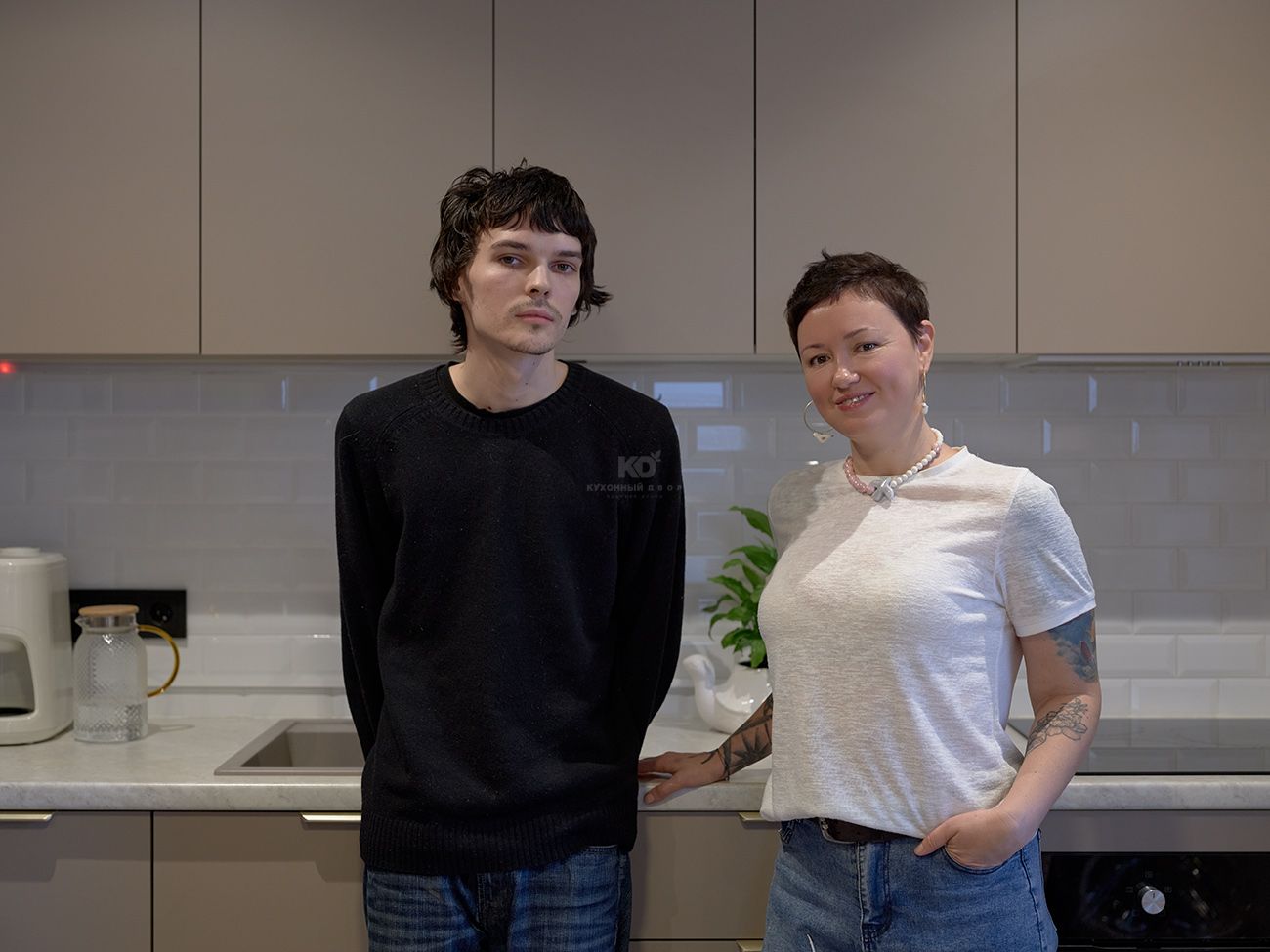 Большая рабочая поверхность идеально подходит для одного человека: готовить, сервировать и экспериментировать здесь комфортно и просто. Функциональность и практичность — ключевые запросы хозяйки — реализованы в каждой детали, от продуманной эргономики до лаконичных решений в наполнении. Отдельного внимания заслуживает нестандартный ход: по индивидуальным размерам Кристины мы изготовили панель в тон кухни, которая встроена в стену и полностью скрывает коммуникации. Ничего лишнего на виду — только чистая геометрия, порядок и эстетика, поддерживающие характер всей квартиры.