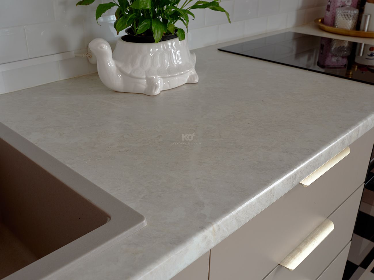Кухня Стоун Колор здесь работает не только как зона готовки, но и как спокойный фон для жизни. Она не спорит с цветом стен и графикой пола, а собирает интерьер в единое целое. Матовые поверхности мягко рассеивают свет, делая пространство визуально теплее и глубже.