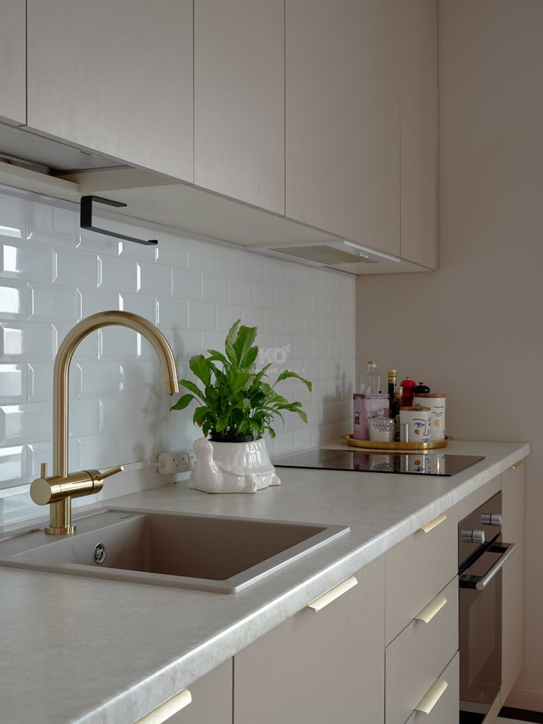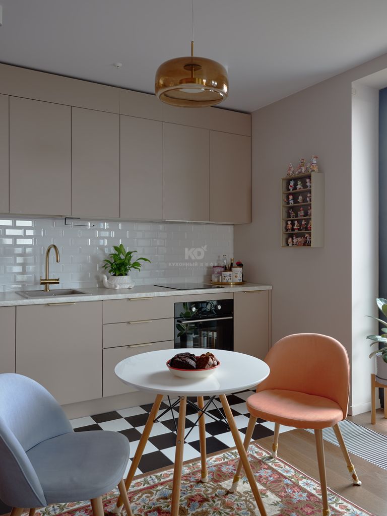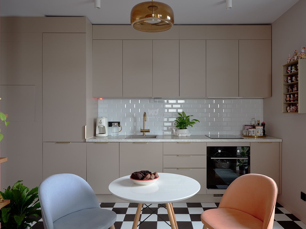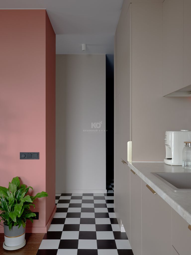 Перед вами наша легенда Стоун Колор. Модель, которая каждый год подтверждает, что список бестселлеров КД покидать она не планирует. Её приглушенные кашемировые фасады привносят баланс в смелую цветовую палитру квартиры. А в качестве деликатных акцентов выбрана фурнитура под матовое золото. Прямая кухня до потолка позволила максимально задействовать пространство — без визуального шума и случайных деталей. Благодаря этому стена выглядит как цельная монолитная конструкция, в которой всё подчинено логике и удобству. Многочисленные зоны хранения аккуратно скрыты за матовыми фасадами и не перегружают интерьер. В центре внимания насыщенная жизнь хозяйки, а не атрибуты быта!