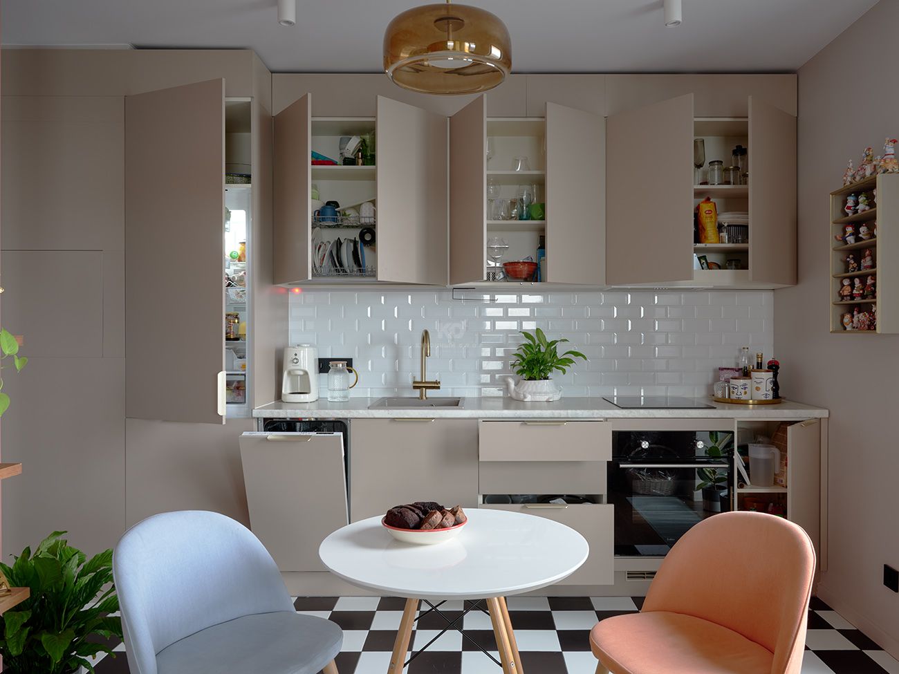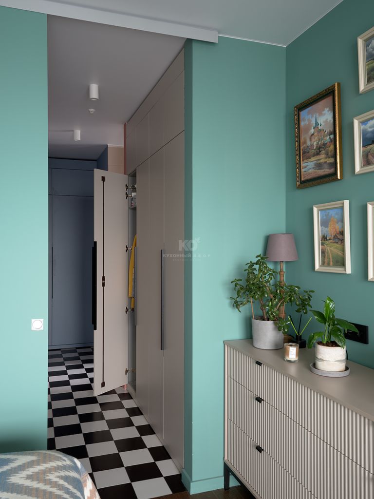 Даешь бой скуке и стандартным решениям! Это девиз Кристины Петровой — хозяйки этой яркой и контрастной квартиры. Она сочетала пыльно-розовые и -голубые стены, шашечки на полу и мебель от КД. Взболтала. И получила идеальное гнёздышко для себя, своего кота и пары попугаев-неразлучников.