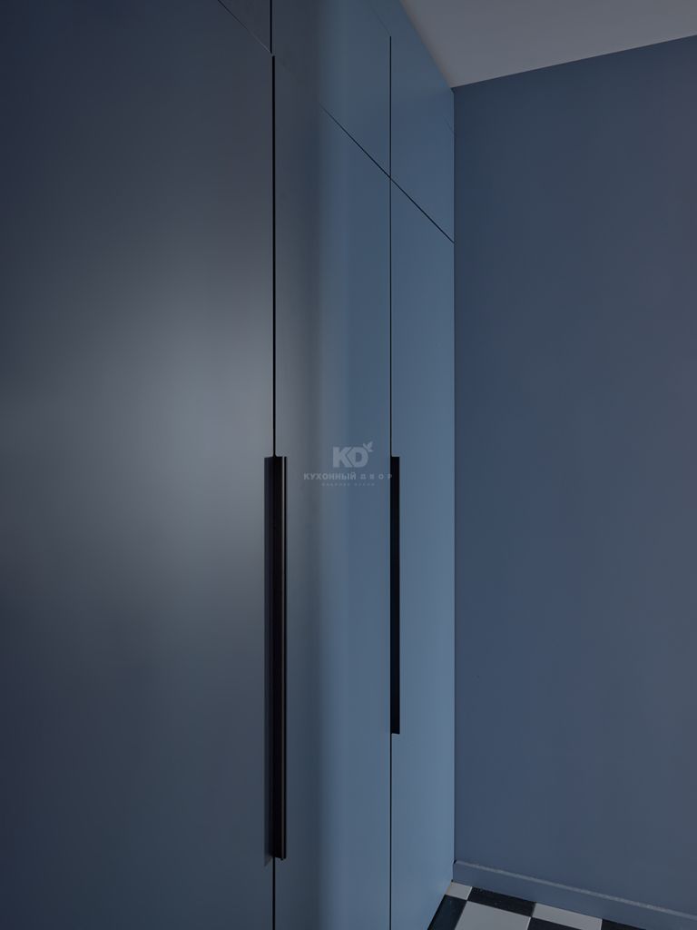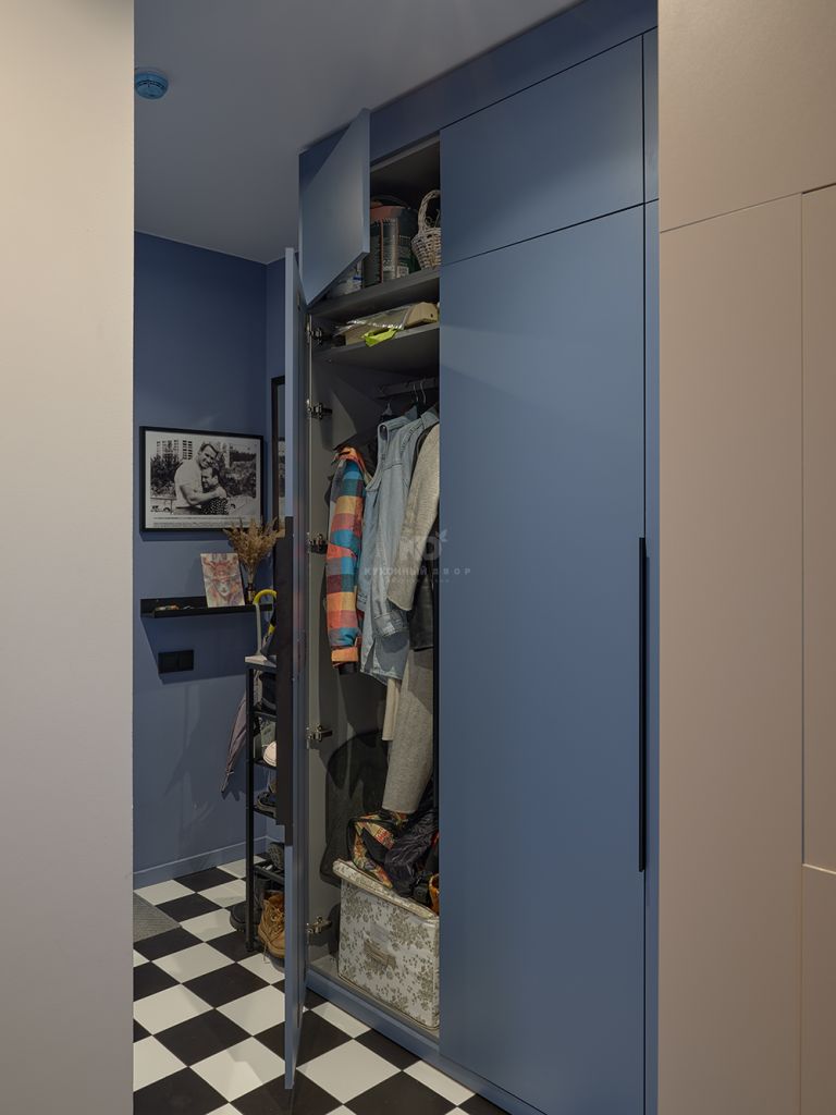 Но кухня Стоун Колор не единственная от КД в этой квартире! Четыре полноразмерных шкафа встроены в ниши в зоне прихожей и у спальни. В одном находятся средства и техника для уборки, во втором — верхняя одежда и обувь, а в третьем и четвертом разместился гардероб Кристины. Круговая планировка квартиры задала особые требования ко всей мебели: ни один элемент не должен был ломать маршрут движения или перетягивать на себя внимание. Именно поэтому кухня и шкафы выполнены в единой стилистике — они как будто растворяются в пространстве, поддерживая его ритм и архитектуру.