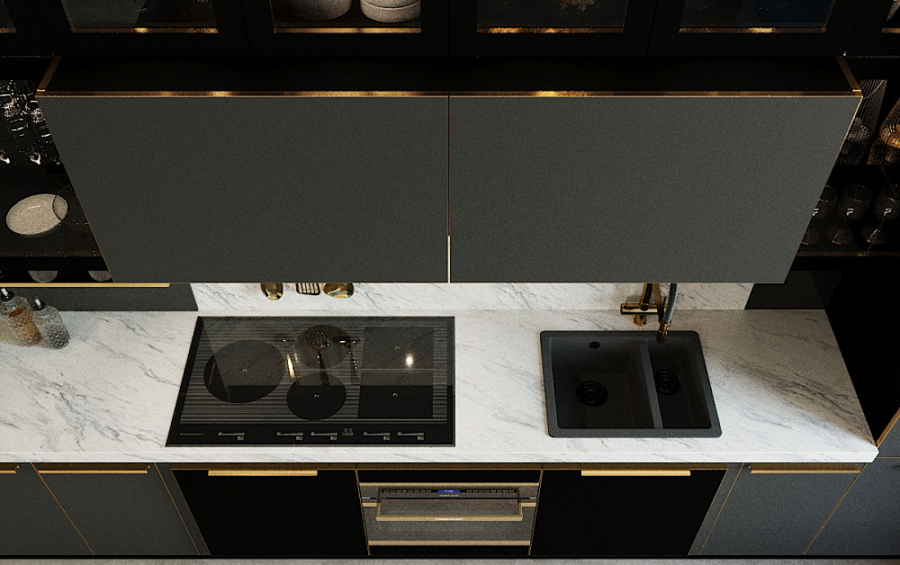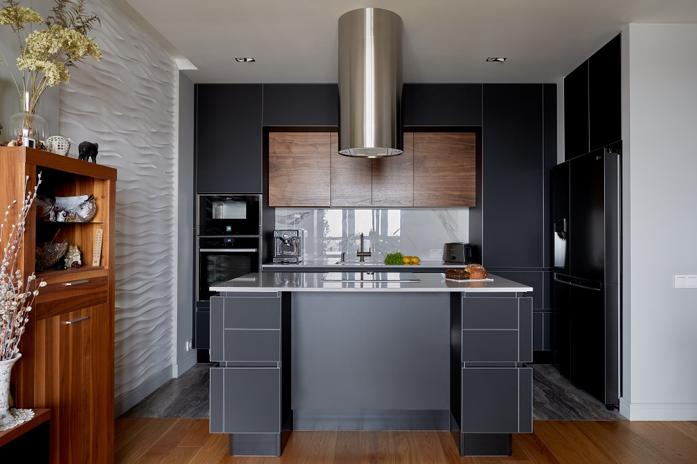 Стоит подумать и об оптимальной конфигурации гарнитура: будете вы устанавливать мебель вдоль одной стены, двух или более. В зависимости от этого и стоит отталкиваться – нужна вам прямая, угловая или П-образная черно-белая кухня на заказ.