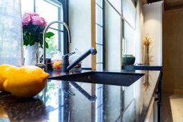 Теперь здесь красуется роскошная модель «Адриана». На месте старого, неудобного и маленького гарнитура, дизайнеры разместили модули чёрного цвета с тёмными фасадами из эмалированного бука. А вдоль длинной стены с окнами и выходом на веранду расположились модули с белыми фасадами и тёмной столешницей из искусственного камня. Столешница бесшовная и стильно «обрамляет» модули у выхода к веранде. Выглядит великолепно!