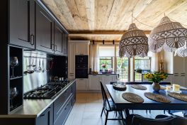 Длинная «белая» зона была оборудована современной бытовой техникой. Здесь за глухими фасадами разместились: большой холодильник, отдельная морозильная камера и посудомоечная машина. Слева в углу на удобной высоте – кофе-машина и вместительный духовой шкаф на 75 литров. А вот варочная панель «прописалась» в «тёмной» зоне. Панель газовая, имеет 5 конфорок и идеально подходит для большого семейства. А чтобы после готовки не пришлось долго убираться, фартук и столешницу здесь решено было сделать из нержавеющей стали. Получился настоящий большой «очаг», где создают изысканные кулинарные шедевры! Стоит ли говорить, об органайзерах, выкатных системах, автодоводчиках и системах полного выдвижения ящиков? Новый гарнитур семьи Тихоновых оснащен превосходно! И знаете – именно такая кухня должна быть в доме, где живет счастье!